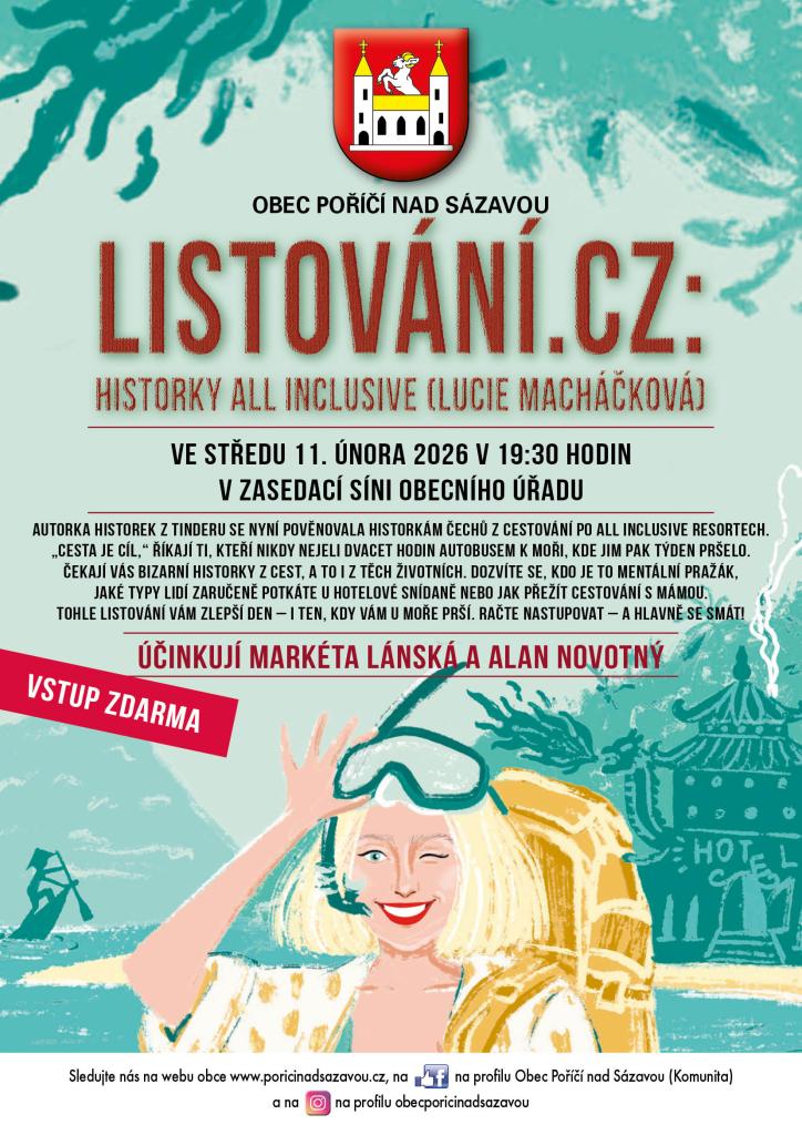 Ve středu 11. února se v zasedací místnosti obecního úřadu uskuteční další večer s Listováním.cz. Tentokrát se můžete těšit na Markétu Lánskou a Alana Novotného v představení Historky All Inclusive! Vstup ZDARMA.